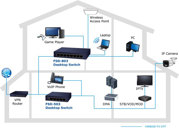 Оснащенный пятью портами 10/100 Мбит/с FSD-803 представляет собой экономичное решение для домашних сетей и сетей SOHO. Сегментируя сеть и уменьшая сетевой трафик, FSD-803 идеально подходит для коммутируемых сетей SOHO. Светодиодные индикаторы, установленные на FSD-803, помогут отслеживать состояние сети.