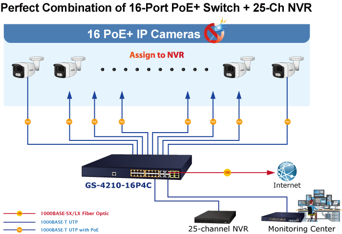 GS-4210-16P4C предоставляет 4 дополнительных гигабитных TP-интерфейса, поддерживающих медные кабели RJ45 10/100/1000BASE-T, для подключения к сетевым устройствам видеонаблюдения, таким как NVR, серверы потокового видео или NAS, для упрощения управления видеонаблюдением. Также, через эти двухскоростные оптоволоконные слоты SFP, он может подключаться к оптоволоконным трансиверам 100BASE-FX/1000BASE-SX/LX SFP (Small Form-factor Pluggable) для передачи сигнала на магистральные коммутаторы и в центры мониторинга на большие расстояния. Дальность передачи может быть увеличена с 550 метров до 2 километров (многомодовое волокно) и до более чем 10/20/40/60/80/120 километров (одномодовое волокно или WDM-волокно). Они хорошо подходят для применения в корпоративных центрах обработки данных и распределительных центрах.