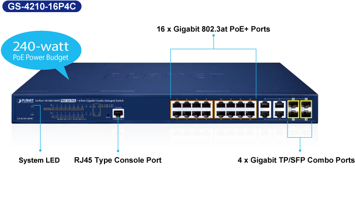 GS-4210-16P4C | 16-Port 10/100/1000T 802.3at PoE + 4-Port Gigabit TP/SFP Combo Managed Switch |