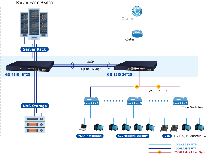 Оборудование с поддержкой Gigabit Ethernet стало основополагающим элементом предприятий и сетевых серверов. Благодаря неблокирующей коммутационной матрице до 58 Гбит/с, GS-4210-24T2S легко обеспечивает локальную высокоскоростную сеть Gigabit Ethernet для магистральной сети предприятий или телекоммуникационных компаний. Функция объединения портов обеспечивает высокоскоростной канал 16 Гбит/с для подключения к магистральной сети при необходимости. Он идеально подходит для использования в качестве коммутатора серверной фермы для подключения серверов. GS-4210-24T2S может обеспечивать восходящий канал связи с периферийной сетью через модули Gigabit Ethernet LX/SX SFP с двумя портами SFP.
