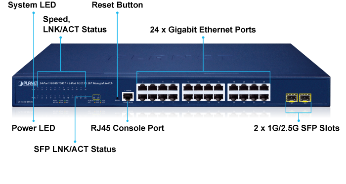 GS-4210-24T2S | 24-Port 10/100/1000T + 2-Port 1G/2.5G SFP Managed Ethernet Switch |