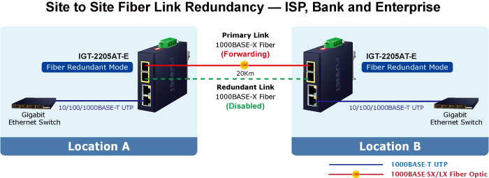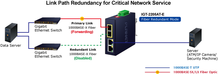 С помощью DIP-переключателя два оптоволоконных SFP-интерфейса IGT-2205AT можно настроить в режиме коммутатора Ethernet или в режиме резервирования оптоволокна. В режиме коммутатора Ethernet устройство может работать в режиме Store-and-Forward с высокой производительностью; в режиме резервирования оптоволокна с двумя портами устройство обеспечивает быстрое резервирование оптоволоконного канала для критически важных приложений Ethernet. Режим резервирования поддерживает функцию автоматического восстановления. Если порт назначения пакета недоступен, он пересылается на другой порт резервной пары.