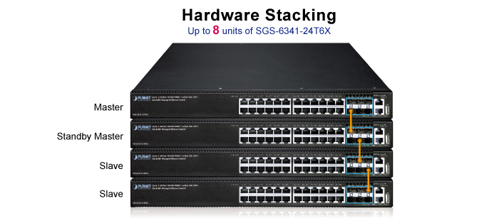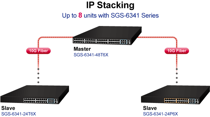 Коммутатор SGS-6341-24T6X, позиционируемый как коммутатор распределительного или агрегационного уровня для крупных сетей, поддерживает функцию стекирования IP-адресов, которая помогает сетевым администраторам легко настраивать до 8 коммутаторов одной серии по одному IP-адресу, вместо того чтобы подключать и настраивать каждый блок по отдельности. Технология стекирования IP-адресов объединяет коммутаторы серии PLANET SGS-6341 в группы, обеспечивая централизованное управление с помощью одного устройства, независимо от физического местоположения или типа коммутатора, при условии, что они подключены к одной локальной сети.