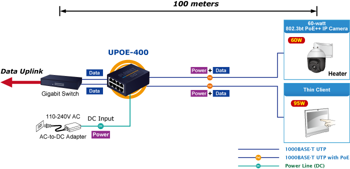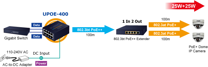 Благодаря выходной мощности PoE до 95 Вт, UPOE-400 может обеспечивать питание PoE-устройств на гораздо большем расстоянии, используя расширитель PLANET PoE Extender, который может быть установлен на расстоянии более 100 метров.