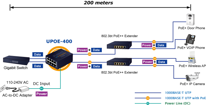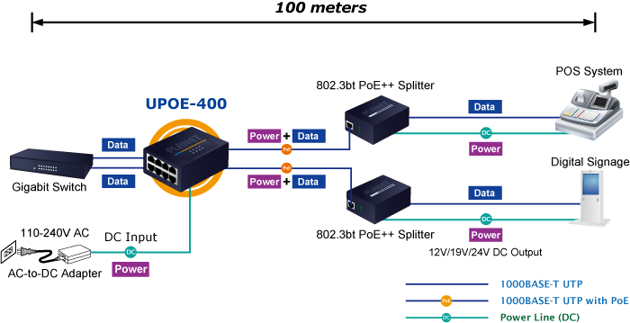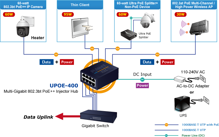 Устройство UPOE-400 устанавливается между обычным коммутатором Ethernet и устройствами PD. Четыре порта являются сетевыми (Ethernet) портами для ввода данных, а остальные четыре порта — портами PoE++ для передачи данных и питания. Питание и данные передаются одновременно по кабелям UTP на различные устройства PD стандарта 802.3bt/at без влияния на производительность и функциональность существующей сети. Благодаря передаче данных и питания по Ethernet из одного устройства, UPOE-400 позволяет сократить количество силовых кабелей и исключить необходимость в выделенных электрических розетках на стене, потолке или в любом другом труднодоступном месте.