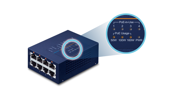 UPOE-400 позволяет пользователям легко и эффективно отслеживать текущее состояние потребленя энергии PoE благодаря усовершенствованной светодиодной индикации. Светодиодный индикатор «Power LED» позволяет пользователю узнать наличие питания на вводе. Индикатор «PoE Usage», отображаемый на передней панели UPOE-400, имеет три янтарных светодиодных индикатора, показывающих различное потребление энергии: 50 Вт, 100 Вт и 160 Вт. С помощью светодиодного индикатора потребления энергии UPOE-400 позволяет администратору отслеживать состояние потребления энергии подключенных устройств PD в режиме реального времени.