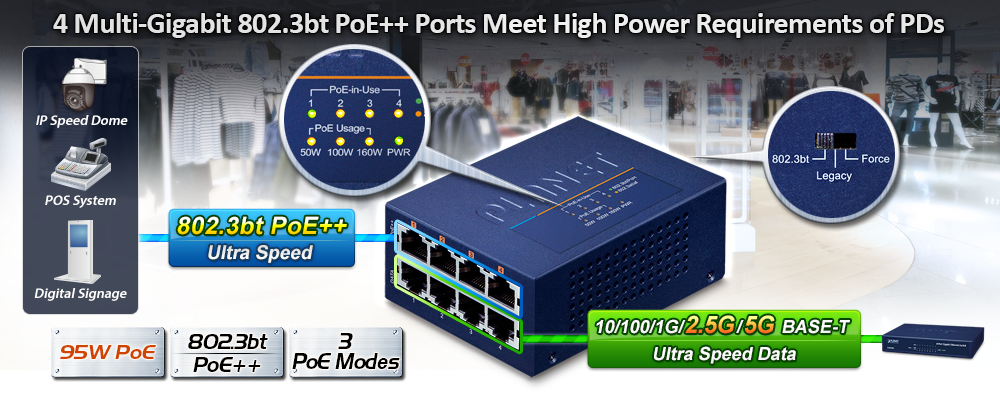 Концентратор PLANET UPOE-400 с четырьмя гигабитными портами PoE++ 802.3bt оснащен четырьмя инжекторами PoE++ 802.3bt типа 4 мощностью 95 Вт каждый, работающими в сетях 10/100/1G/2.5G/5GBASE-T. Общий бюджет PoE составляет 160 Вт, что позволяет передавать питание PoE++ 802.3bt по кабелям Ethernet UTP, обеспечивая одновременную передачу данных и питания на удаленное устройство (PD), работающее в сетях 802.3bt/at.