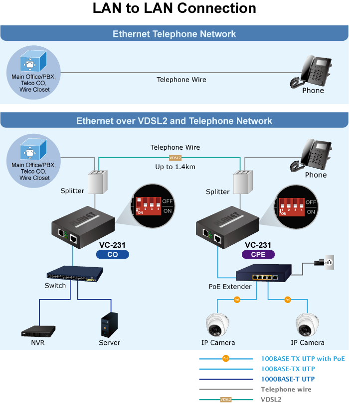 Два преобразователя VC-231 могут работать как автономная пара, что хорошо подходит для увеличения дальности действия Ethernet по существующим телефонным проводам. Используя всего одну пару медных проводов AWG-24, можно легко соединить две сети Ethernet с максимальной скоростью передачи данных 100 Мбит/с. Телефонная связь может продолжаться и во время работы CO/CPE преобразователя VC-231. Два решения, перечисленные ниже, являются типичными примерами применения моста Ethernet поверх VDSL2.