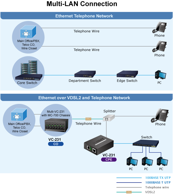 VC-231 — идеальное решение для быстрого и экономичного предоставления высокоскоростных сетевых услуг многоквартирным зданиям, таким как жилые дома (многоквартирные), коммерческие здания (многоквартирные), гостиницы и больницы. Используя существующую телефонную инфраструктуру, можно легко создать новую сеть без необходимости прокладки новых кабелей. Благодаря скорости передачи данных до 100/100 Мбит/с (быстрая, 30 А 6 дБ) легко можно предоставлять услуги VoD, IP-телефонии и различные широкополосные услуги.