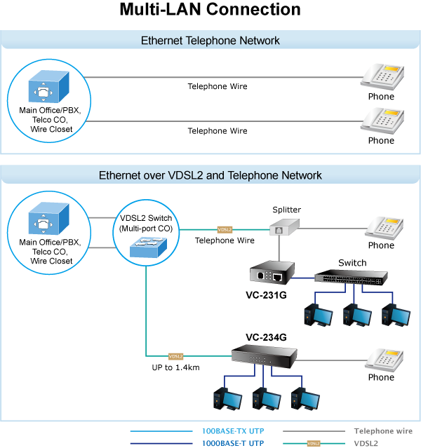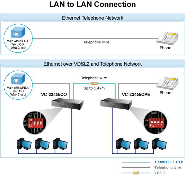 Два моста VC-234G могут работать как автономная пара, что хорошо подходит для увеличения дальности действия Ethernet по существующим телефонным проводам. Используя всего одну пару медных проводов AWG-24, можно легко соединить две сети Ethernet с максимальной скоростью передачи данных 200 Мбит/с. Телефонная связь может продолжаться и во время работы CO/CPE VC-234G. Два решения, перечисленные ниже, являются типичными примерами применения моста Ethernet поверх VDSL2.