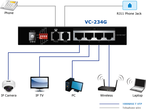 VC-234G также является мостом Long Reach Ethernet (LRE), предоставляющим четыре порта Ethernet RJ45 и два телефонных разъема RJ11, один из которых предназначен для подключения VDSL, а другой — для подключения POTS (обычная телефонная связь). VC-234G имеет встроенный разветвитель POTS для совместного использования существующей телефонной линии с POTS; поэтому нет необходимости заменять существующую медную проводку. Просто подключите VC-234G к существующему телефонному разъему RJ11, и можно будет подключить высокопроизводительную сеть VDSL2. VC-234G идеально подходит для использования в качестве расширителя Ethernet-сети.