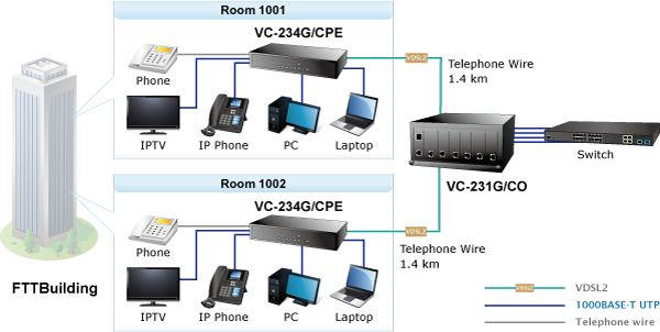 VC-234G — идеальное решение для быстрого и экономичного предоставления высокоскоростных сетевых услуг многоквартирным зданиям, таким как жилые дома (многоквартирные), коммерческие здания (многоквартирные), гостиницы и больницы. Используя существующую телефонную инфраструктуру, можно легко создать новую сеть без необходимости прокладки новых кабелей. Благодаря скорости передачи данных до 324/60 Мбит/с (G.INP, асимметричная, 8 дБ) легко обеспечить предоставление услуг VoD, IP-телефонии и различных широкополосных услуг.