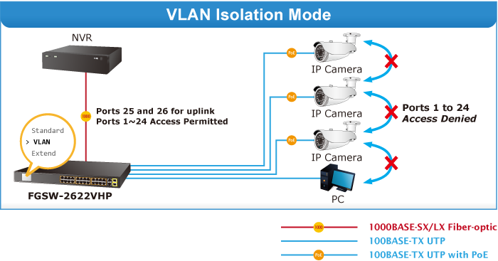 PLANET FGSW-2622VHP поддерживает режимы работы Standard, VLAN и Extend. FGSW-2622VHP работает как обычный коммутатор IEEE 802.3af/at PoE в стандартном режиме работы. Режим работы VLAN включает функцию VLAN на основе порта, которая может помочь предотвратить влияние многоадресного или широковещательного шторма IP-камеры друг на друга.