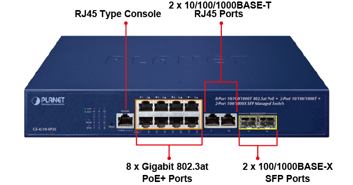 GS-4210-8P2C оснащен 2 дополнительными интерфейсами 10/100/1000BASE-T RJ45 для подключения к сетевым видеорегистраторам, серверам потокового видео и серверов NAS. А в двух оптоволоконных слотах SFP он может использовать трансиверы 100BASE-FX и 1000BASE-SX/LX SFP для восходящей связи с магистральным коммутатором и удаленным центром мониторинга. Расстояние передачи данных можно увеличить с 550 метров до 2 километров (многомодовое волокно) и до 10/20/40/60/80/120 километров (одномодовое волокно или волокно WDM). Коммутатор хорошо подходят для прменения в корпоративных системах обработки и распределения данных.