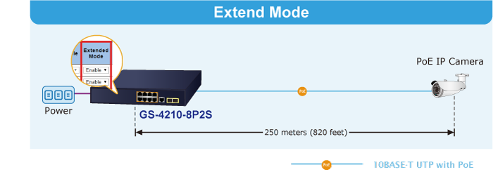В режиме «Extend» GS-4210-8P2S работает для каждого порта в дуплексном режиме со скоростью 10 Мбит/с, и при этом может поддерживать выходную мощность PoE 50 Вт на расстоянии до 250 метров, преодолевая ограничение в 100 м по кабелю Ethernet UTP. Благодаря этой новой функции коммутатор представляет собой решение для увеличения расстояния передачи питания PoE 802.3at/af, что снижает затраты на установку кабеля Ethernet.