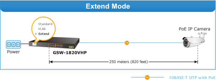 В режиме Extend GSW-1820VHP работает для каждого порта в дуплексном режиме со скоростью 10 Мбит/с, но может поддерживать выходную мощность PoE 20 Вт на расстоянии до 250 метров, преодолевая ограничение в 100 метров для кабеля Ethernet UTP. Благодаря этой совершенно новой функции GSW-1820VHP обеспечивает дополнительное решение для расширения расстояния PoE 802.3at, тем самым экономя затраты на установку кабеля Ethernet. Его функция изоляции VLAN изолирует порты, чтобы предотвратить широковещательный шторм и защитить подмену DHCP в расширенном режиме работы.