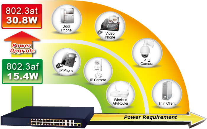 Предлагая надежную технологию коммутации и расширенные сетевые функции, GSW-2824P оптимизирует управление питанием сетевых устройств, таких как точки беспроводного доступа, телефоны VoIP и камеры видеонаблюдения. Это также сокращает время и затраты на развертывание за счет интеграции коммутации питания и данных в одном устройстве и освобождает сетевые устройства от ограничений по расположению розеток и дополнительной проводки переменного тока.