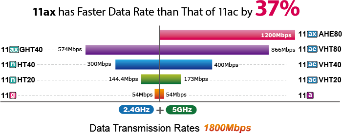PLANET IAP-1800AX, использующий стандарт IEEE 802.11ax Wi-Fi 6, обеспечивает высокоскоростную передачу. Максимальная скорость беспроводной связи в диапазоне 2,4 ГГц составляет до 11ax (574 Мбит/с), а в диапазоне 5 ГГц — до 11ax (1201 Мбит/с). Беспроводные соединения 2,4 ГГц и 5 ГГц также можно использовать одновременно.