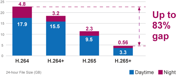 В ICA-4280 используются технологии H.265(+), позволяющая камере обеспечивать более высокую и эффективную степень сжатия изображения. Если тот же уровень качества изображения H.264 сравнить с H.265, последний может сэкономить около 50% полосы пропускания, а это означает, что H.265(+) обеспечивает гораздо более высокое качество видео для меньшей пропускной способности. Таким образом, он может еще больше повысить общую производительность своей системы IP-видеонаблюдения.