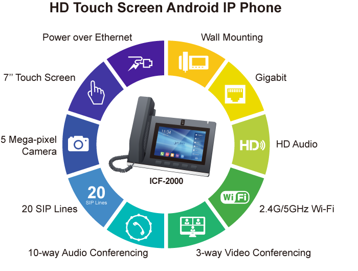 ICF-2000 — имеет 7-дюймовый цветной сенсорный экран высокой четкости и является SIP-конференц-телефоном со встроенной 5-мегапиксельной камерой. Этот новейший усовершенствованный цветной мультимедийный IP-телефон создает захватывающий опыт видеообщения по сети. Благодаря сочетанию технологий и дизайна ОС Android он имеет большую совместимость и обладает мощными функции. Его большой дисплей и значки на интерфейсе обеспечивают прямой доступ к часто используемым функциям, а интеллектуальная сенсорная клавиатура с полным набором функций обеспечивает простоту использования. Высокое разрешение делает видеоконференции очень практичными, удобными и высококачественными.