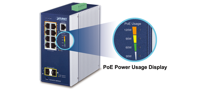 Диаграммы энергопотребления в веб-интерфейсе управления IGS-4215-4P4T позволяет администратору отслеживать уровень энергопотребление подключенных устройств в режиме реального времени, что значительно повышает эффективность управления объектами. Кроме того, IGS-4215-4P4T позволяет пользователям отслеживать текущее использование мощности PoE с помощью светодиодного индикатора. На передней панели IGS-4215-4P4T расположены четыре янтарных светодиода, указывающие четыре различных уровня использования мощности PoE, а именно: 30 Вт, 60 Вт, 90 Вт и 120 Вт.