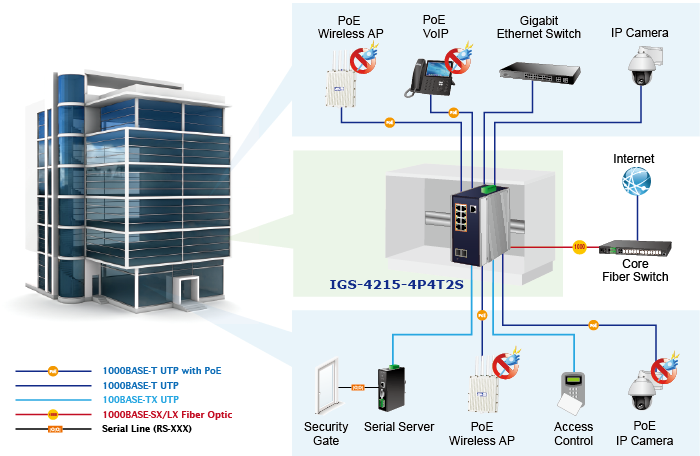 IGS-4215-4P4T2S, подходящий для зданий со строгим соблюдением мер безопасности, с восемью интерфейсами питания Gigabit Ethernet 802.3at PoE+ позволяет легко обеспечить централизованное питание для системы IP-телефонии, системы IP-наблюдения и группы беспроводных точек доступа. в суровых промышленных условиях. Например, можно легко установить 4 IP-камеры PoE или беспроводные точки доступа PoE для наблюдения или создать среду беспроводного роуминга в промышленной зоне. Без ограничения мощности розетки IGS-4215-4P4T2S упрощает и повышает эффективность установки IP-камер или беспроводных точек доступа.