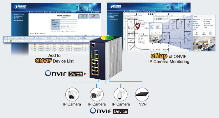 PLANET недавно разработала потрясающую функцию — поддержку ONVIF, — специально разработанную для взаимодействия с IP-видеонаблюдением. Из графического пользовательского интерфейса IGS-5225-4P2S вам достаточно одного щелчка мыши, чтобы найти и отобразить все устройства ONVIF через сетевое приложение. Кроме того, вы можете открыть веб-страницу камеры по ссылке на IP-адрес, чтобы получить информацию о мониторинге в реальном времени и статус онлайн/оффлайн через IP-камеру из графического пользовательского интерфейса IGS-5225-4P2S.
