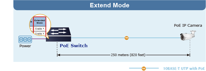 В режиме работы «Extend» IGS-5225-4P2S работает для каждого порта в дуплексном режиме со скоростью 10 Мбит/с, но может поддерживать выходную мощность PoE 22 Вт на расстоянии до 250 метров, преодолевая ограничение в 100 метров для кабеля Ethernet UTP. Благодаря этой совершенно новой функции IGS-5225-4P2S обеспечивает дополнительное решение для расширения расстояния PoE 802.3at/af, тем самым экономя затраты на установку кабеля Ethernet.