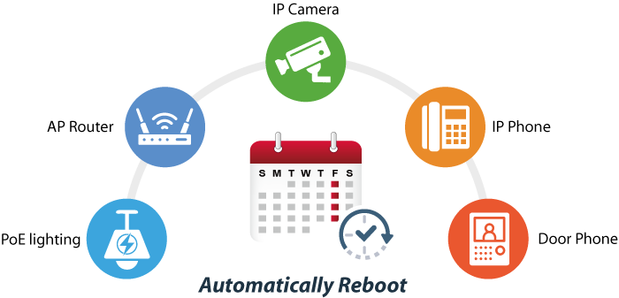 IGS-5225-4P2S позволяет перезагружать каждую из подключенных IP-камер PoE или точек беспроводного доступа PoE согласно расписанию. Тем самым он уменьшает вероятность сбоя IP-камеры или точки доступа в результате переполнения буфера.