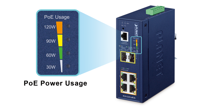 IGS-5225-4P2S помогает пользователям легко и эффективно отслеживать текущий статус использования мощности PoE с помощью усовершенствованной светодиодной индикации. На передней панели промышленного гигабитного коммутатора PoE+ расположены четыре оранжевых светодиода, указывающие потребляемую мощность PoE 30, 60, 90 и 120 Вт.