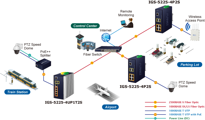 Благодаря стандарту IEEE 802.3at Power over Ethernet IGS-5225-4P2S может напрямую подключаться к любым сторонним устройствам, совместимым с IEEE 802.3af/802.3at, таким как IP-камеры PTZ (панорамирование, наклон и масштабирование), скоростные купольные камеры, цветные сенсорные камеры, аппараты VoIP и многоканальные точки доступа к беспроводной локальной сети. Беспроводная локальная сеть была бы более эффективной для транспортной станции, поскольку обеспечивала бы путешественникам высокоскоростной и глобальный доступ в Интернет. Благодаря структуре беспроводной локальной сети PoE транспортная администрация получает выгоду от меньших затрат, обеспечивая при этом более качественные интернет-услуги в более широких областях для путешественников.