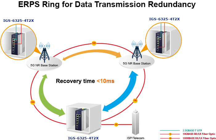 IGS-6325-4T2X поддерживает технологию резервного кольца и обладает мощными возможностями быстрого самовосстановления для предотвращения прерываний и внешних вторжений. Он поддерживает передовую технологию ERPS (защитное переключение Ethernet-кольца) ITU-T G.8032, протокол Spanning Tree Protocol (802.1s MSTP) и резервруемую систему питания в сеть промышленной автоматизации заказчика для повышения надежности системы и времени безотказной работы в суровых производственных условиях. В простой кольцевой сети время восстановления канала передачи данных может достигать 10 мс.