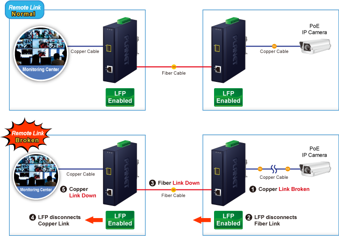 LLCF означает, что когда устройство, подключенное к конвертеру и линии TP, теряет связь, оптоволоконный порт конвертера отключит линию передачи.