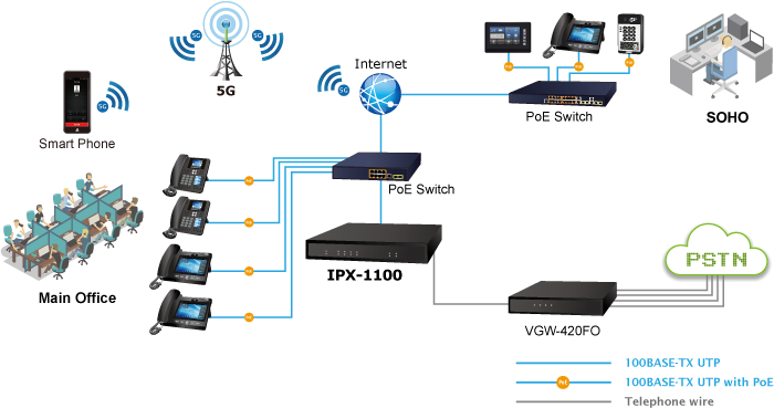 IPX-1100 играет важную роль в создании надежной системы VoIP для малого и среднего бизнеса (SMB). При полной интеграции со шлюзами PLANET VoIP (серии VGW) IPX-1100 расширяет поддержку аналоговых соединений. Эта интеграция гарантирует бесперебойную связь, охватывающую существующие вызовы PSTN, аналоговые телефоны, IP-телефоны и конечные точки на базе SIP.
