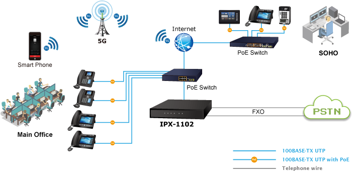 IPX-1102, оснащенный двумя интерфейсами FXO, создает систему УАТС, поддерживающую 2 аналоговых вызова. Это обеспечивает бесперебойную связь между существующими вызовами PSTN, аналоговыми телефонами, IP-телефонами и конечными точками на базе SIP.