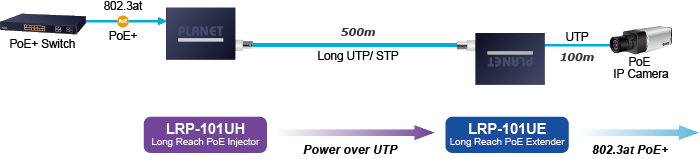Инжектор LRP-101UH питается от источника PoE IEEE 802.3at/af и передает данные и питание по кабелю UTP на удлинитель LRP-101UE. PoE PD, соответствующий стандарту IEEE 802.3at/af, будет автоматически получать питание от LRP-101UE через кабель UTP.