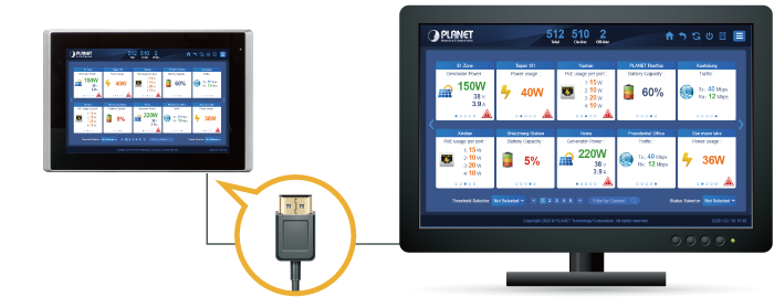 NMS-360V поддерживает интерфейс HDMI, который можно легко подключить к другому экрану большего размера, чтобы пользователь мог более четко контролировать сеть. Им также можно управлять из любого места через веб-браузер, чтобы открыть больше экранов монитора, которые могут получить доступ к управляемым узлам в сети с поддержкой DHCP, таким образом управляя несколькими устройствами через другой ПК, ноутбук или планшет.