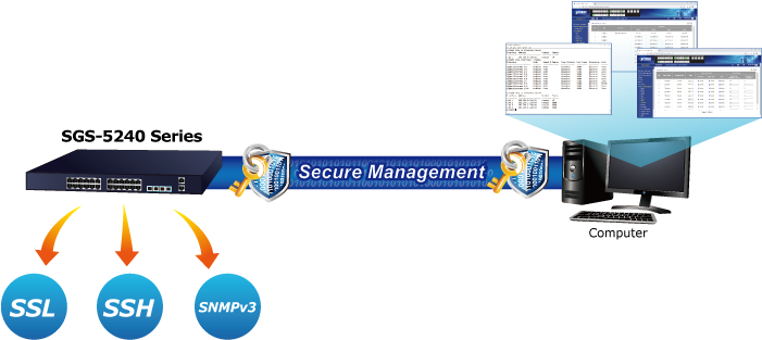 Более того, серия SGS-5240 предлагает безопасное удаленное управление, поддерживая соединения SSHv2 и SSLv3, которые шифруют содержимое пакета в каждом сеансе.