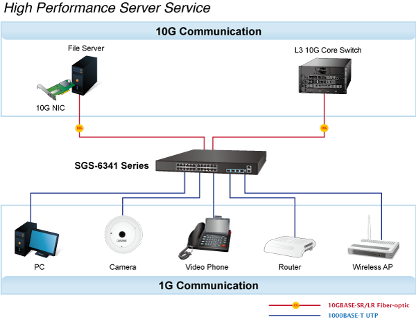 Четыре слота SFP+, встроенные в серию SGS-6341, поддерживают двухскоростную передачу 10GBASE-SR/LR или 1000BASE-SX/LX. Благодаря восходящим интерфейсам 10 Гбит/с серия SGS-6341 может похвастаться высокопроизводительной архитектурой коммутатора, способной обеспечить неблокирующую коммутационную матрицу и пропускную способность на скорости до 128 Гбит/с, что значительно упрощает задачи модернизации локальной сети для удовлетворения растущих потребностей в полосе пропускания.