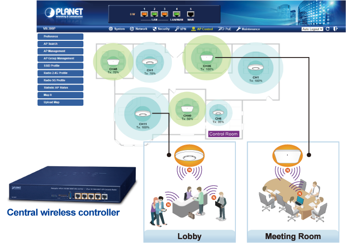 VR-300P обеспечивают централизованное управление точками доступа серии PLANET Smart через удобный веб-интерфейс. Точку доступа легко настроить для беспроводного SSID, радиодиапазона и настроек безопасности. Благодаря четырехэтапному процессу настройки профили беспроводной связи для различных целей могут быть одновременно доставлены нескольким точкам доступа или группам точек доступа, чтобы минимизировать время, усилия и затраты на развертывание.