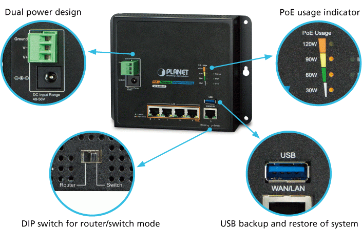 PLANET WGR-500-4P — это промышленный маршрутизатор с поддержкой 802.3at PoE+, предназначенный для сетей Интернета вещей (IoT). Он имеет бюджет до 120 Вт и уникальный механизм PoE, который облегчает управление Ethernet PoE PD более эффективно в промышленных сетях, таких как фабрики, транспорт, правительственные здания и другие общественные места. Он также имеет следующие специальные функции управления и эксплуатации. WGR-500-4P — лучшее решение для промышленного маршрутизатора.