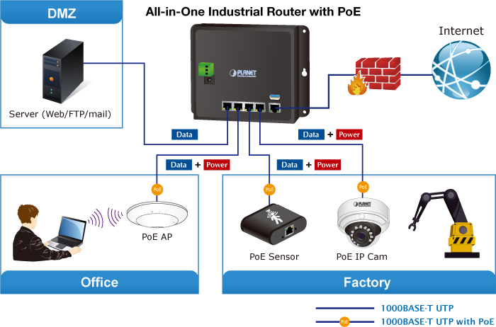 PLANET WGR-500-4PV может работать как универсальный маршрутизатор в промышленном применении для компании, имеющей завод и множество различных подразделений. Имея до 4 линейных интерфейсов питания PoE+, WGR-500-4PV может централизованно управлять электроснабжением завода, где производятся IP-камеры PoE и датчики PoE. Он также обеспечивает подключение к данным для офисной документации. В то же время WGR-500-4PV может разделять пользователей и устройства IoT с помощью VLAN для обеспечения хорошей производительности. Благодаря защите брандмауэром он защищает сеть IoT от угроз, тем самым делая промышленную сеть более безопасной.