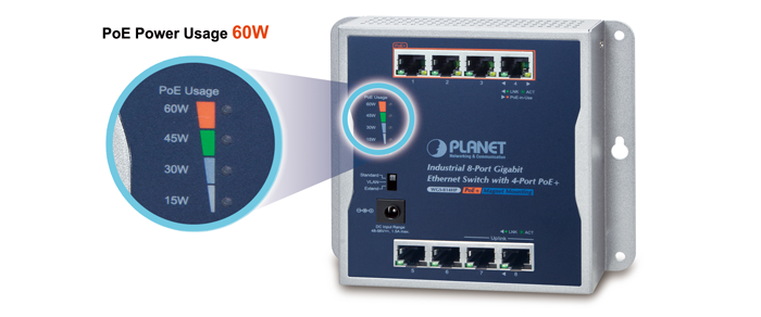 Для облегчения автоматического управления питанием в WGS-814HP реализована функция управления бюджетом мощности, которая помогает предотвратить перегрузку бюджета мощности. Более того, WGS-814HP помогает пользователям легко и эффективно отслеживать текущий статус использования мощности PoE с помощью усовершенствованной светодиодной индикации. На передней панели WGS-814HP, называемой «Использование мощности PoE», расположены четыре светодиода, указывающие потребляемую мощность 15 Вт, 30 Вт, 45 Вт и 60 Вт.