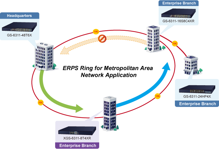 XGS-6311-8T4XR поддерживает технологию резервного кольца и обладает мощной и быстрой способностью самовосстановления для предотвращения сбоев и внешних вторжений. Он поддерживает передовую технологию ITU-T G.8032 ERPS (Ethernet Ring Protection Switching), протокол Spanning Tree (802.1s MSTP) и резервированное питание для повышения надежности системы и времени безотказной работы в различных средах. В простой кольцевой сети время восстановления канала передачи данных может достигать 15 мс.