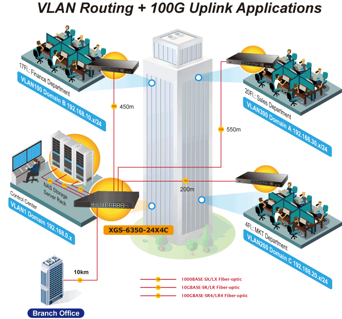 XGS-6350-24X4C оснащен двадцатью четырьмя оптоволоконными интерфейсами SFP+ 10 Гбит/с и четырьмя оптоволоконными интерфейсами QSFP28 100 Гбит/с. Каждый из слотов SFP+ поддерживает Dual Speed, 10GBASE-SR/LR или 1000BASE-SX/LX, а каждый из слотов QSFP28 поддерживает собственные режимы 100 Gigabit Ethernet, 40G и 4 x 10 Gigabit Ethernet. Таким образом, администратор может гибко выбирать подходящий трансивер SFP не только в зависимости от расстояния передачи, но и требуемой скорости передачи. Расстояние можно увеличить с 550 метров до 2 км (многомодовое волокно) или до 10/20/30/40/50/70/120 км (одномодовое волокно или волокно WDM). Он хорошо подходит для использования в центрах обработки и распределения данных.